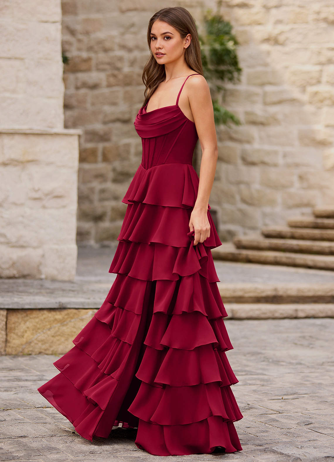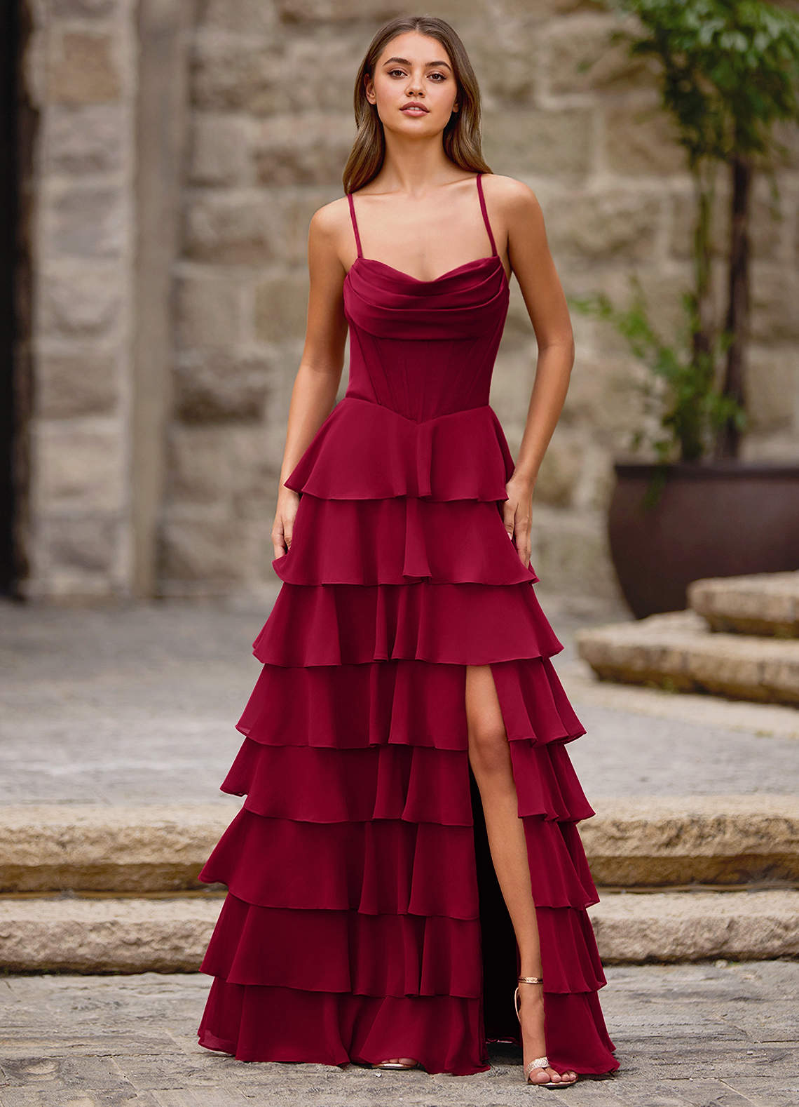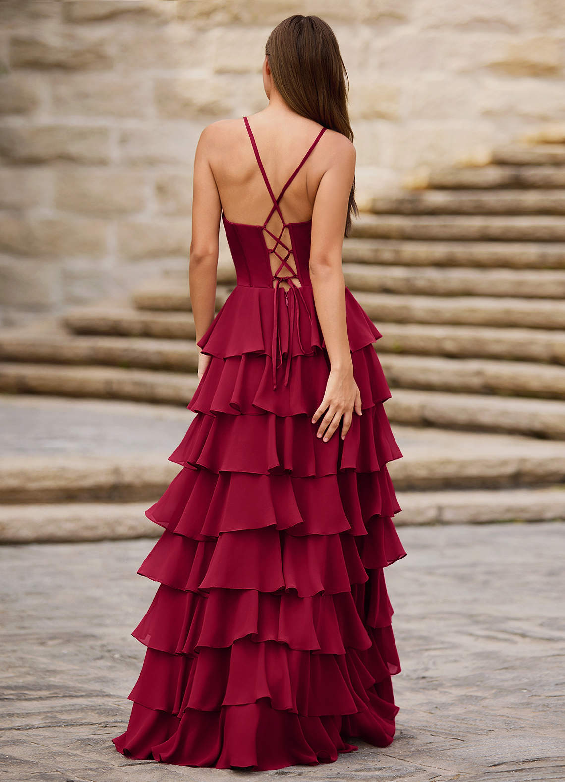 Rhythm Dark Red Ruffled A-Line Prom Dress Dress