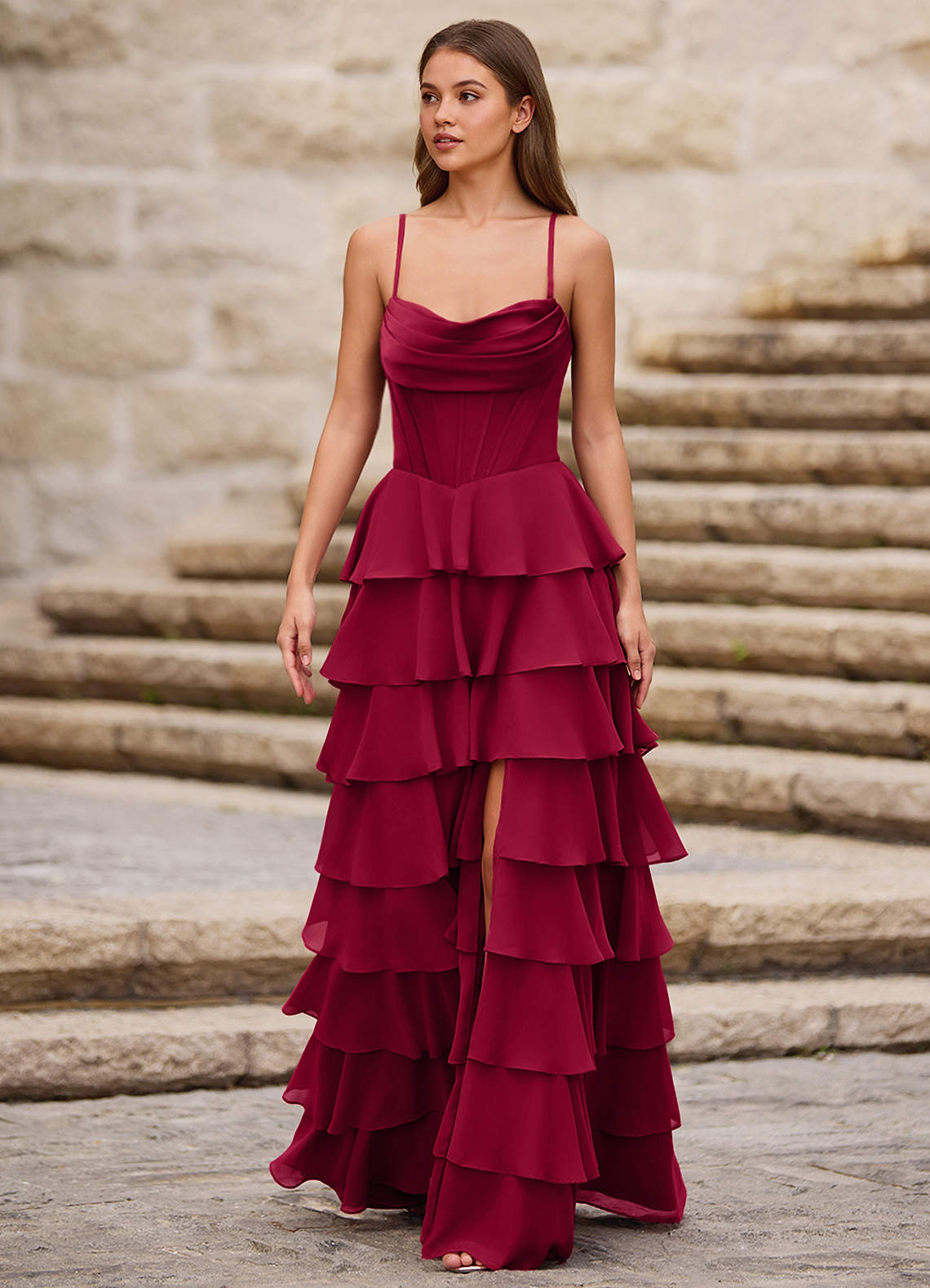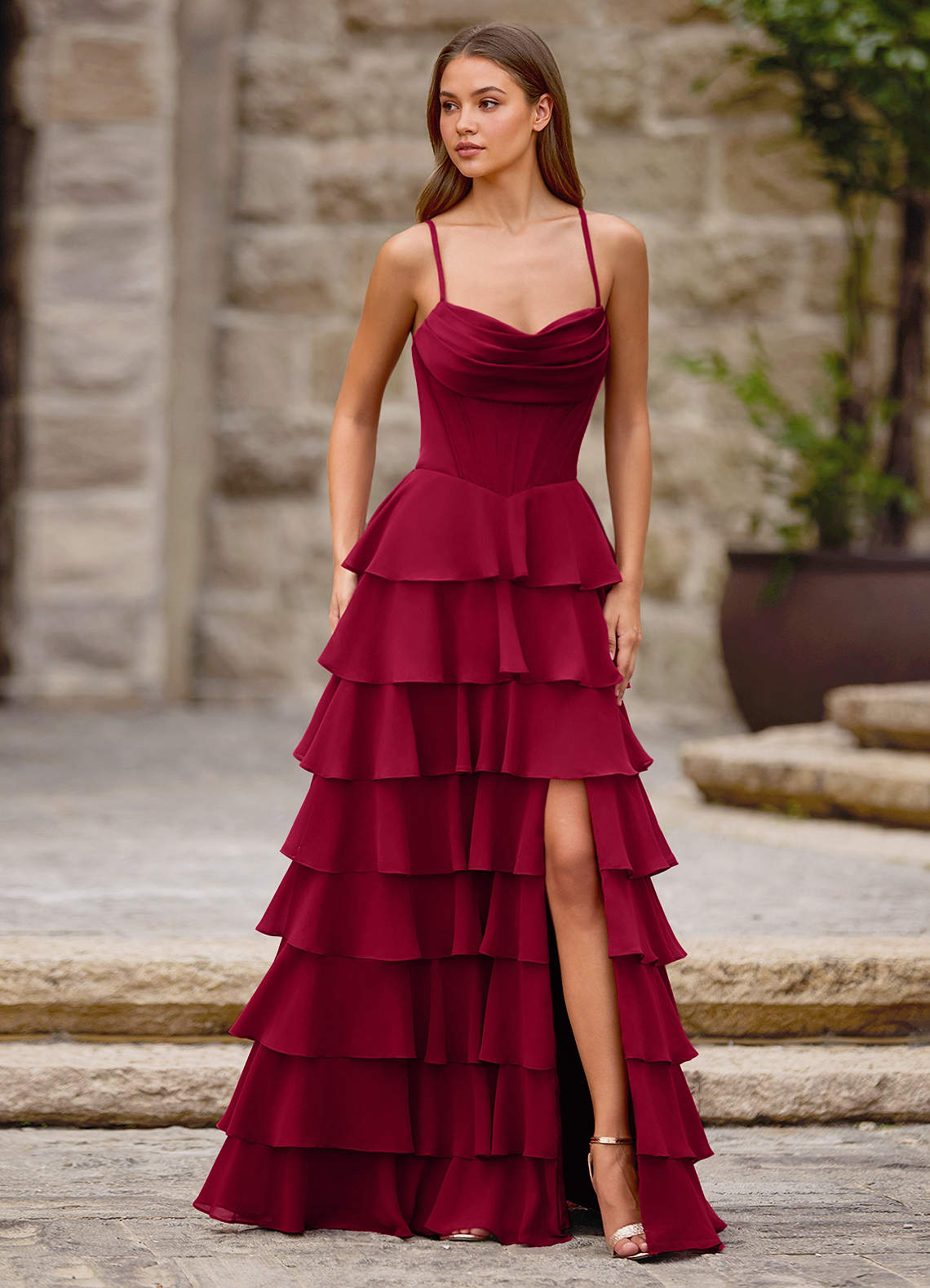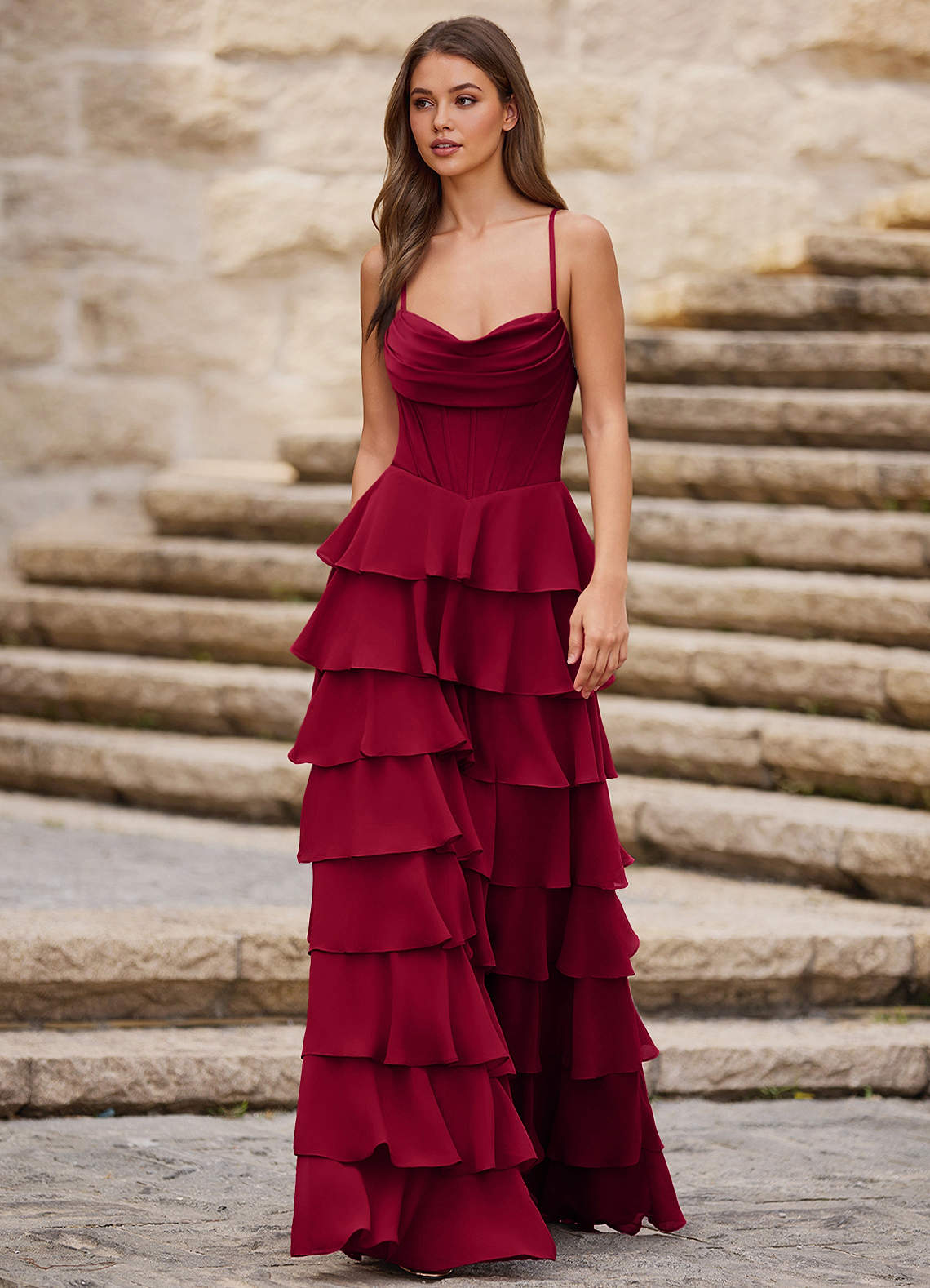 Rhythm Dark Red Ruffled A-Line Prom Dress Dress